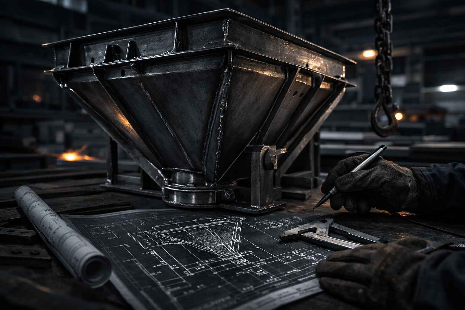 Costruiamo tramogge e contenitori metallici su specifiche tecniche del cliente, per impianti di stoccaggio, dosaggio e movimentazione materiali.